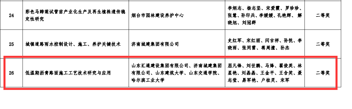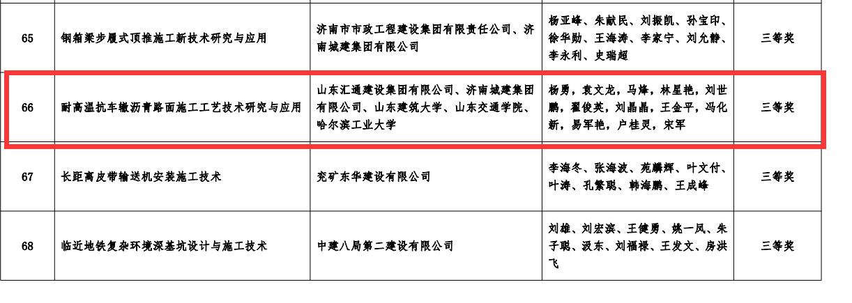 近日,山東匯通建設集團有限公司工程管理部根據濟南土木建筑學會轉發的《推薦2021年度“山東土木建筑科學技術獎”》的通知要求和評審辦法積極組織申報建設科技創新成果獎。公司申報的3項課題全部獲獎,其中“低溫期瀝青路面施工工藝技術研究與應用”項目獲二等獎,“耐高溫抗車轍瀝青路面施工工藝技術研究與應用”項目獲三等獎,“道路基層多功能砼側模施工工藝技術研究與應用”項目獲三等獎。三個項目經專家評價總體達到國家先進水平。