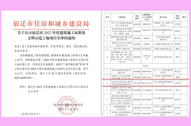 用心做好文明施工積極打造文明示范工地沭陽縣臺(tái)州路改造工程(道路部分)獲評(píng)標(biāo)準(zhǔn)化文明示范工地 3月21日,宿遷市住房和城鄉(xiāng)建設(shè)局公布了2022年度建筑施工標(biāo)準(zhǔn)化文明示范工地項(xiàng)目,集團(tuán)承建的沭陽縣臺(tái)州路改造工程(杭州路至珠海路)(道路部分)工程獲評(píng)。 2022上半年,工程曾榮獲江蘇省省級(jí)星級(jí)標(biāo)準(zhǔn)化安全文明工地。項(xiàng)目部始終貫徹落實(shí)集團(tuán)創(chuàng)優(yōu)工作,對(duì)安全文明工地進(jìn)行提前策劃,施工過程嚴(yán)格按照質(zhì)量標(biāo)準(zhǔn)管理,本次宿遷市建筑施工標(biāo)準(zhǔn)化文明示范工地申報(bào)工作,項(xiàng)目部及上級(jí)單位高度重視、提前組織、精心準(zhǔn)備,也充分展現(xiàn)了集團(tuán)安全文明施工的管理水平和企業(yè)文化。 接下來,項(xiàng)目部將堅(jiān)定不移地推行施工工藝標(biāo)