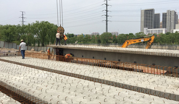 5月18日上午9時,濱河南路拓寬改造工程第一塊T型板梁正式開始吊裝。該橋設(shè)計寬26米,橋跨18米,橋型為一跨簡支變截面肋梁橋,主梁采用裝配式后張預(yù)應(yīng)力混凝土變截面T梁,吊裝后濕接。經(jīng)過連續(xù)不間斷作業(yè),于下午16時圓滿完成七塊主梁、兩塊邊梁,共計九塊板梁的吊裝任務(wù),比原計劃提前一天,至此標志著橋梁主體結(jié)構(gòu)工程順利完成。為保障此次吊裝作業(yè)的順利進行,項目部科學(xué)部署,精心組織,提前策劃,并與交警等相關(guān)部門充分溝通,確定合理的運輸路線和時間。項目部設(shè)立吊裝安全保障小組、明確責任分工;詳細制定切實可行的施工方案,做到以方案指導(dǎo)施工;認真做好各項施工前準備工作:包括技術(shù)準備、機械設(shè)備準備、勞動組織準備、施