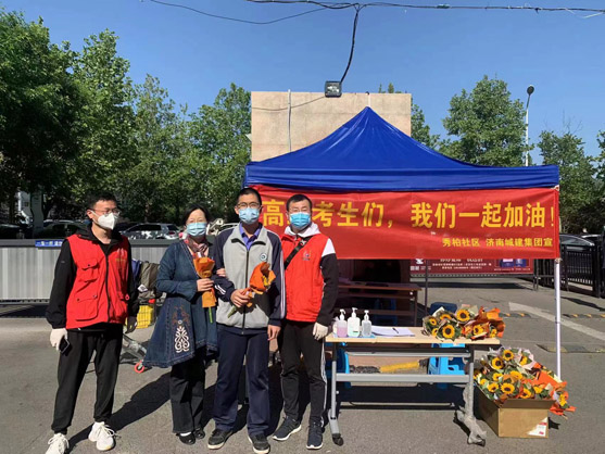 “高三考生們,我們一起加油!” 在領(lǐng)秀城秀柏社區(qū)的防疫志愿服務(wù)站,一條大紅色的條幅,一朵朵象征著太陽與光明、生機與活力的太陽花在陽光的照射下格外絢爛醒目。今天是五一勞動節(jié)也是高三考生因疫情封閉后第一天復課的日子。 在這個特別的節(jié)日里,領(lǐng)秀城秀柏社區(qū)的防疫先鋒隊第一小組組長榮峰提前一天就定購好了100朵鮮花,一大早,當高三學生走到小區(qū)門口,志愿者們就將一朵朵鮮艷的太陽花和祝福卡送到學生手中,“想起了向日葵就想起了陽光,微笑和美好常在,我們一起加油!” “叔叔,太謝謝你們了,你們在加班加點為我們服務(wù),還給我們送花,真是讓我倍受鼓舞。”“太感謝你們了,謝謝志愿者們這些日子以來對我們